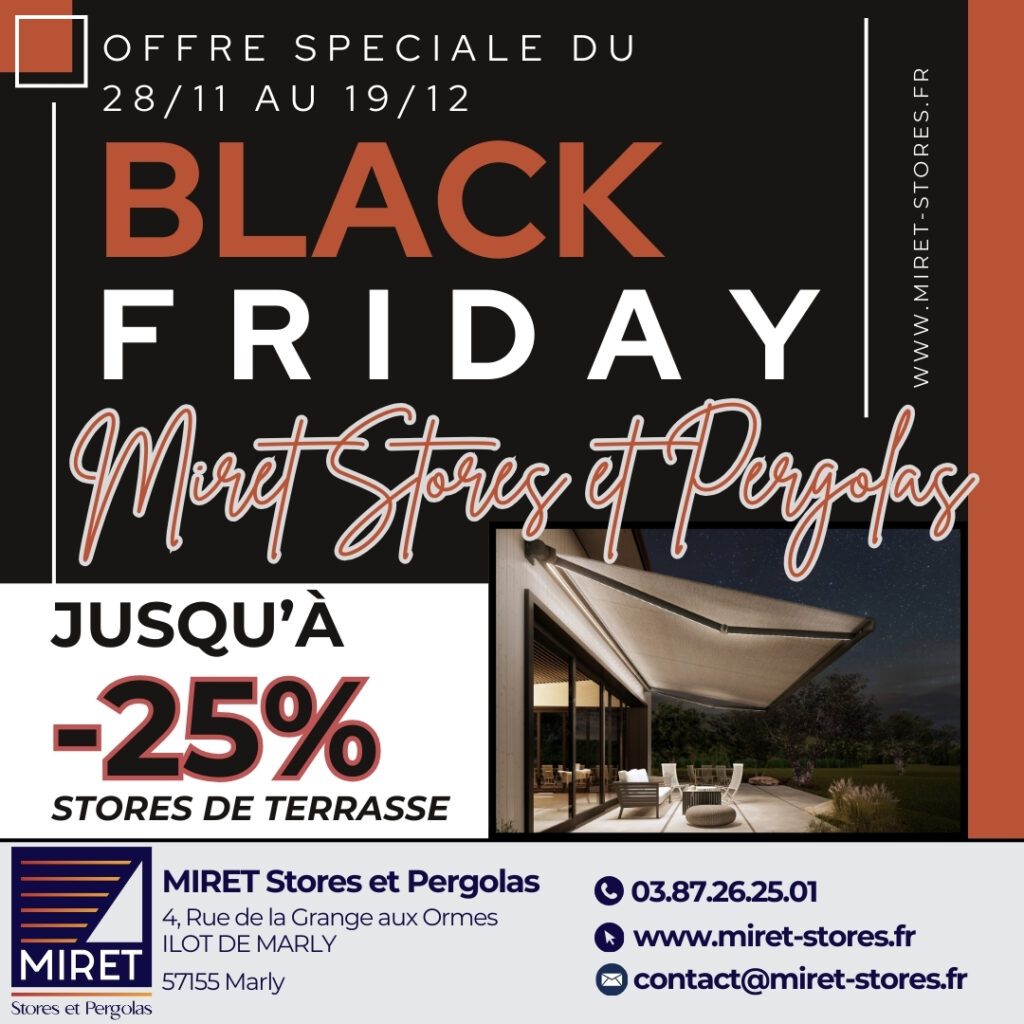 MIRET Stores & Pergolas lance son offre Black Friday du 28 novembre au 19 dĂ©cembre, avec des remises exceptionnelles allant jusquâĂ -30% sur une sĂ©lection de produits.